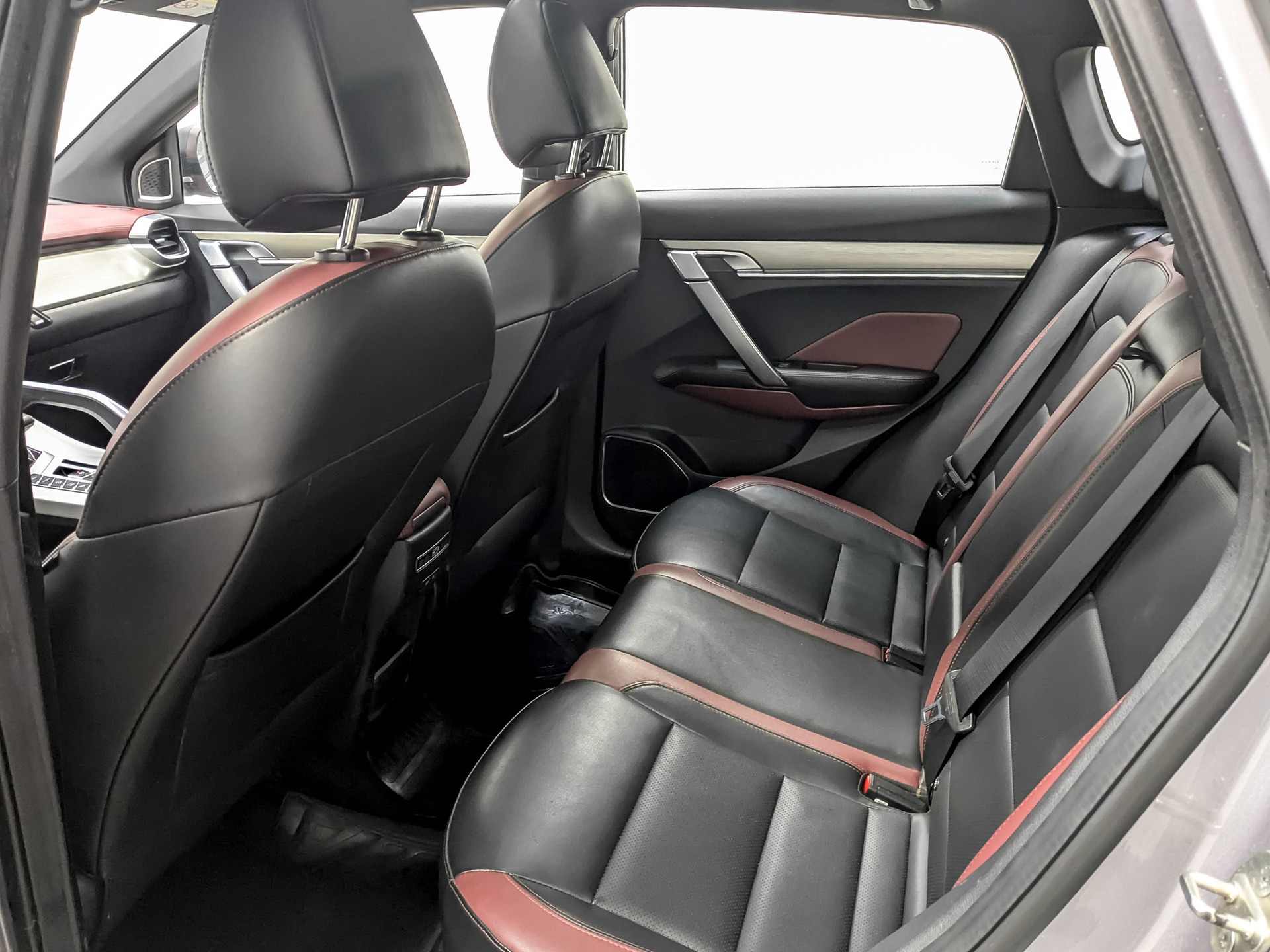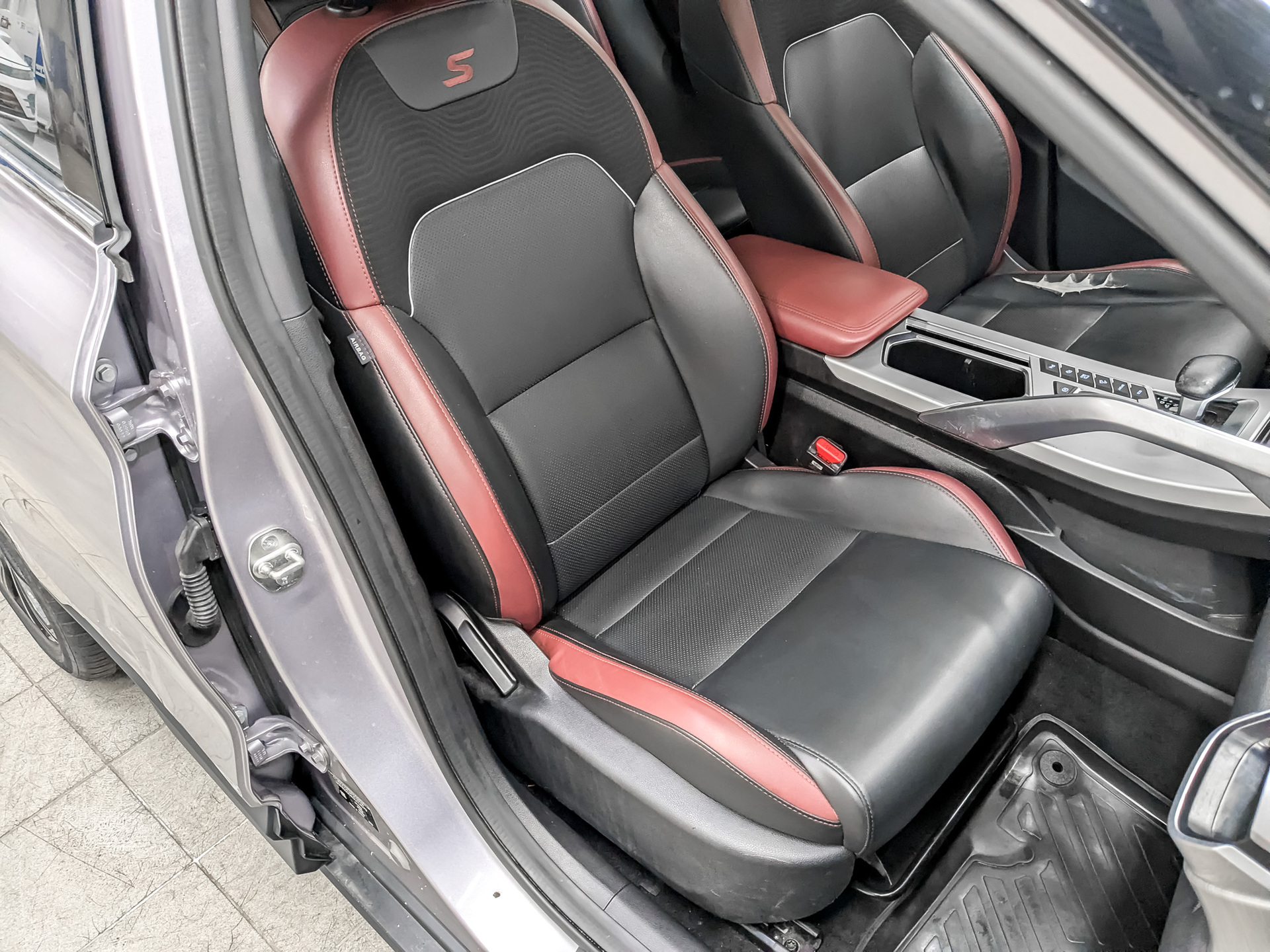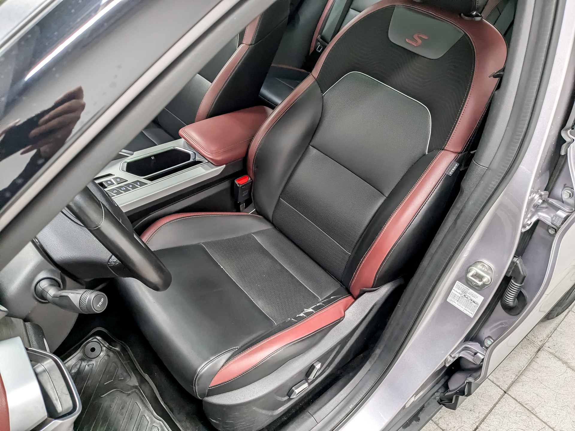 Комбинированная обивка сидений (ткань и экокожа) тёмного цвета с красными вставками